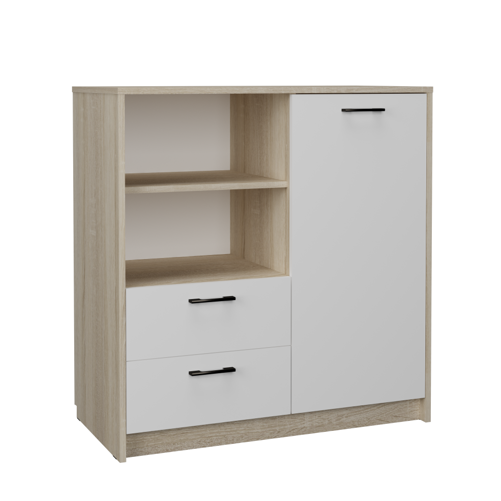 Конструктивной особенностью данной тумбы является: распашная дверца с полочкой внутри, открытая ниша с двумя малыми и одним большим - выдвижными ящиками.