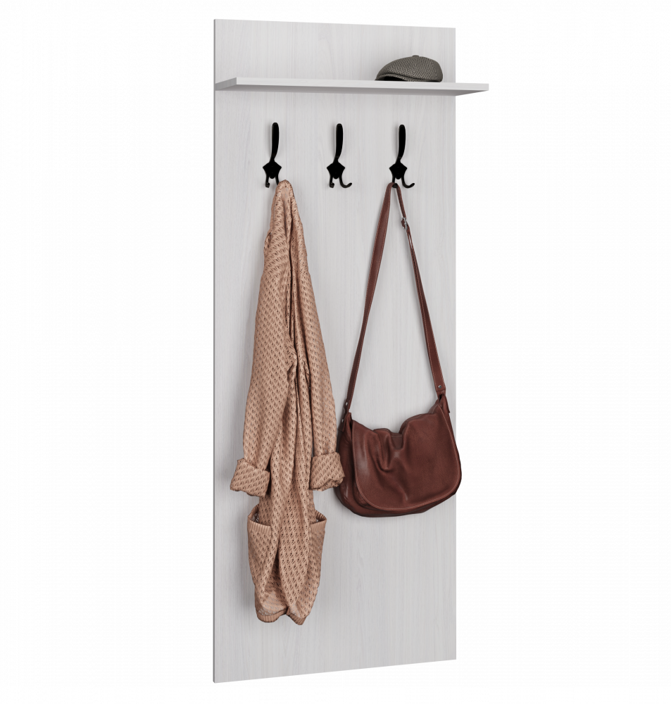 Компактная конструкция сочетает в себе крючки для верхней одежды и вместительную полку для хранения головных уборов.