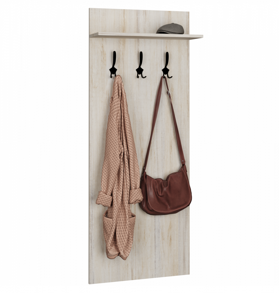 Компактная конструкция сочетает в себе крючки для верхней одежды и вместительную полку для хранения головных уборов.